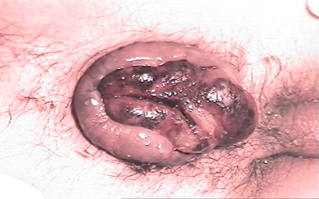 (3)肛缘呈环状或接近环状肿物突起,痔体间界限消失或基本消失,腹压增高时,内痔环形脱出,齿线下移至肛缘或肛缘以下。先便血后脱垂,轻者只在大便时脱垂,便后可自行回复,重者需用手推回,更严重者是稍加腹压即脱出肛外,如咳嗽,行走等腹压稍增时,痔块就能脱出,回复困难,无法参加劳动。 >>点击查看图片